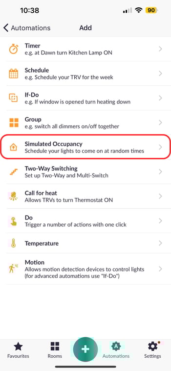 From the menu, select Automations, then tap Simulated Occupancy from the list of automation types.