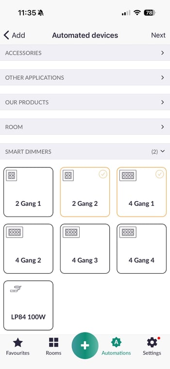 Choose the devices you want to include — for example, lamps, sockets, or other lights. You can select multiple devices to make your routine more realistic.