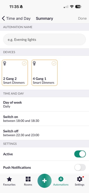 Review your settings, ensure the Active toggle is turned on, and tap Done to save. Your chosen devices will now switch on and off automatically according to your schedule.
